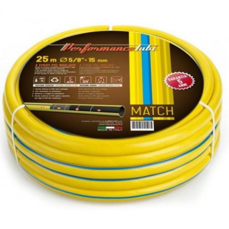 Tubo da irrigazione 4 strati in PVC magliato con filo elicoidale ANTITORSIONE Dotato di estrema flessibilità ed elasticità il tubo Match è particolarmente resistente. Il filo elicoidale posto sotto la maglia gli conferisce un’estrema resistenza alle strozzature ed alle torsioni. È adatto per tutti gli usiStrato interno in PVC nero antialga Filo elicoidale in poliestere Rinforzo a maglia in poliestere Strato esterno in PVC giallo coprente con riga in PVC blu coestrusa.