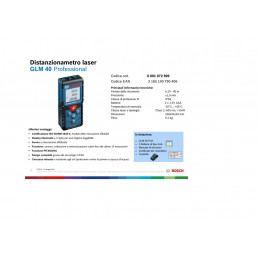 Mod. GLM 40 distanziometro laser con portata 0,15 - 40 m. Precisione 1,5 mm. Lettura agevole, grazie al display illuminato che mostra gli ultimi tre risultati. Classe di protezione IP54. Batterie 2x1,5V LR03 AAA. Classe laser e tipologia Class 2, 635 nm, 1mW. Suono a misurazione effettuata. Tutte le principali modalit normale calcolo di lunghezze, superfici e volumi, nonche misurazioni indirette di altezze. Custodia protettiva. Dimensioni 41 x 24 x h 150 mm. Peso 0,100 kg