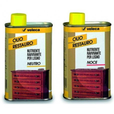 OLIO RESTAURO - Nutriente per legno Nutriente e ravvivante per legno. Soluzione liquida a base di oli speciali, studiata per pulire, nutrire e ravvivare il legno. Olio restauro è un prodotto di facile applicazione, indicato per il trattamento di mobili, porte e travi. Può essere usato su legno grezzo e/o verniciato. Grazie alla sua particolare formulazione, Olio restauro penetra nei pori del legno alimentandone le fibre. Olio restauro è da sempre usato dagli ebanisti per fare risaltare alla massima intensità, le venature ed i particolari colori naturali del legno. Infatti l’olio, applicato direttamente su legno grezzo, nutre e ravviva la fibra del legno. Su superfici trattate a gommalacca, l’olio elimina le macchie difficili da togliere, questo perchè penetrando in profondità, porta il legno alla stessa tonalità di colore. Usato regolarmente, Olio Restauro evita possibili screpolature e mantiene quindi sano il legno. L’applicazione di 1 mano di prodotto è solitamente sufficiente per nutrire e ravvivare il legno. L’olio neutro è consigliato per il trattamento del legno chiaro. Olio noce accentua ulteriormente le tonalità del legno e rende uniforme il colore della superficie trattata. CARATTERISTICHE: • Essiccazione completa: 24 ore • Colore: neutro e noce • Residuo secco: 55% • Tipo di solvente: ragia minerale inodore • Tipo di legante: olio minerale e resina idrocarburica • Peso specifico: 0,850
