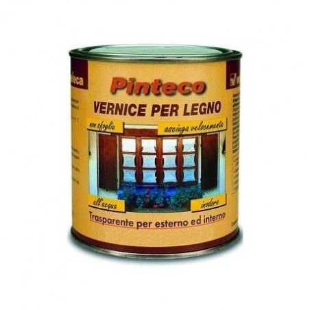 PINTECO - Vernice di finitura trasparente per esterno lucida o satinata/effetto cera - INODORE Vernice di finitura trasparente lucida o satinata, indicata per il trattamento di tutti i manufatti di legno che richiedono un’ottima protezione superficiale sia all’esterno che all’interno della casa. Prodotto all’acqua indicato per la finitura e/o il ripristino di tutti i tipi di legno gia’ trattati con impregnante sia all’acqua che a solvente; e’ un prodotto di buona elasticita’, resistente agli urti ed ai graffi. Pinteco e’ una vernice indicata per la finitura di serramenti, balconi, perlinature e manufatti di legno in genere destinati sia all’esterno che all’interno della casa. E’ una vernice trasparente che aderisce perfettamente e protegge il legno dagli agenti atmosferici. Pinteco non sfoglia ma si consuma con il passare degli anni, non ingiallisce, rende la superficie piena e morbida al tatto. E’ una vernice inodore all’acqua ed è quindi utilizzabile anche all’interno senza particolari precauzioni. Pinteco fa risaltare e mantiene nel tempo la naturale bellezza del legno. CARATTERISTICHE: - Diluizione: a pennello il prodotto è pronto per l’uso - a spruzzo diluire al 5% con acqua. - Resa media, teorica-indicativa: 8/10 mq. con ml.750 = 11 - 13 mq. con 1 lt. - Applicare il prodotto a temperatura superiore a 15°C. - Residuo secco: 33% lucida - 33% satinata. - Tipo di legante: resine acriliche-poliuretaniche. - Tipo di solventi: acqua. - Peso specifico: 1,030. - Essicazione: superficiale 1 ora - completa 24 ore.