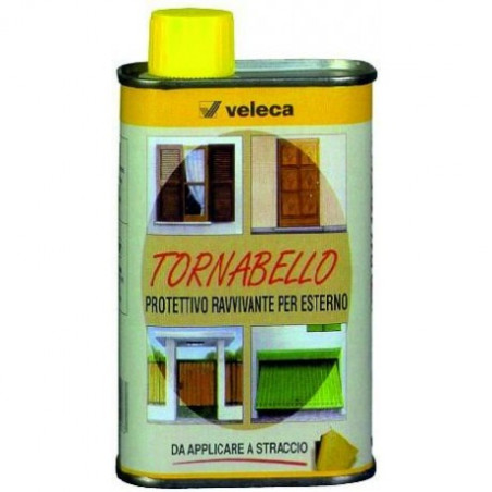 RINNOVA LA VERNICE DEI SERRAMENTI ESTERNI Protettivo e ravvivante per esterno. E’ una miscela di oli e resine selezionate, indicata per rinnovare, ravvivare e proteggere le superfici verniciate di legno e ferro esposte all’esterno. Contiene filtri U.V. resistenti. Non sfoglia. Particolarmente indicato per il trattamento di manutenzione e protezione di porte, finestre, persiane, balconi, fiorere, cancellate ed in genere per tutte le superfici deteriorate dall’azione devastante delle intemperie (pioggia, vento, sole, smog, ecc...). Tornabello lascia una sottilissima pellicola trasparente che ravviva il colore e riporta il grado di brillantezza originario; rende la superficie idrorepellente proteggendola dallo sporco e da eventuali screpolature. Con l’applicazione periodica di Tornabello (1-2 volte all’anno) la superficie non necessita di altra manutenzione. CARATTERISTICHE: • Residuo secco: 47% • Tipo di legante: poliuretano oleomodificato • Tipo di solventi: ragia minerale inodore • Peso specifico: 0,850 • Essiccazione: superficiale 1 ora; completa 24 ore