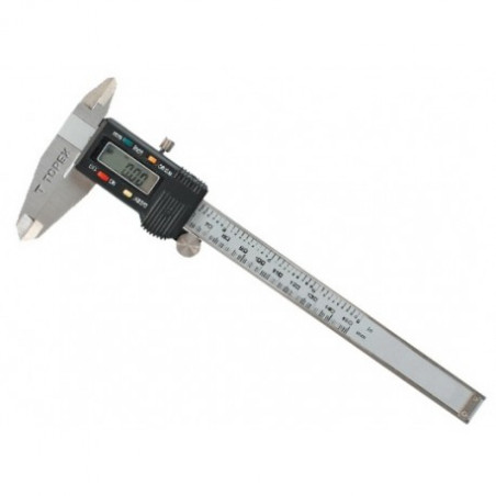 Calibro a corsoio digitale con gamma di 150 mm misura di precisione di misura 0,02 mm . Permette di misurare la profondità, all’interno e all’esterno di dimensioni con i valori riportati nei milimetrI o pollici. Blocco a vite Grande display per una lettura chiara. Funzione di spostamento a zero in qualsiasi posizione.